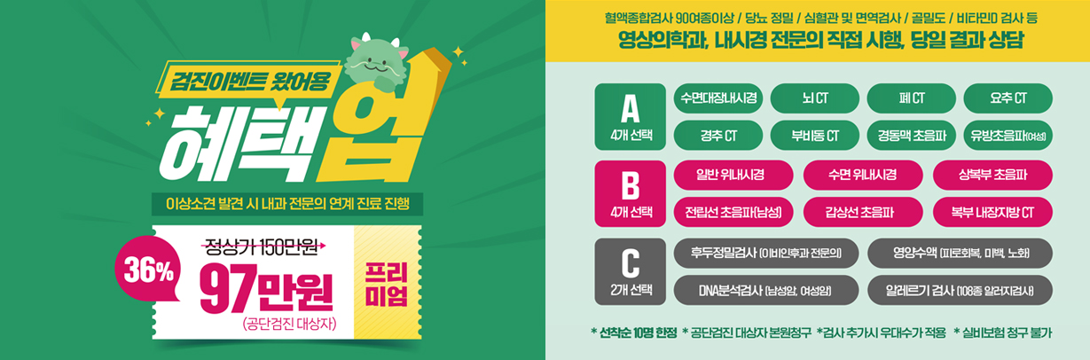 | 수면 위·대장 내시경 | 위암여부, 대장암, 용종제거 등 확인 | |